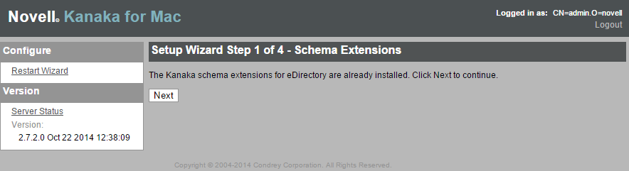 Enter eDirectory credentials capable of modifying directory services and schema, such as an Admin or Admin equivalent.