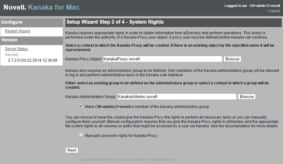 The Kanaka Proxy Object is also created. By default, this user object is automatically assigned Supervisor rights at the root of the eDirectory tree. You can remove this rights assignment and assign rights more granularly to the tree and the associated file systems. The object needs the following minimum rights: