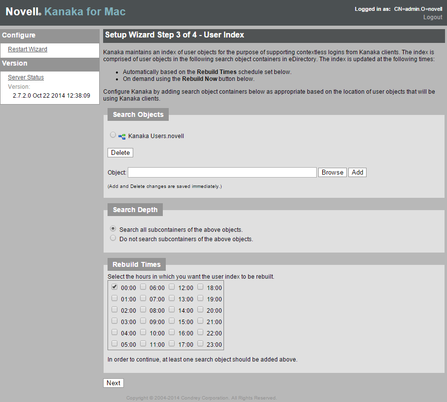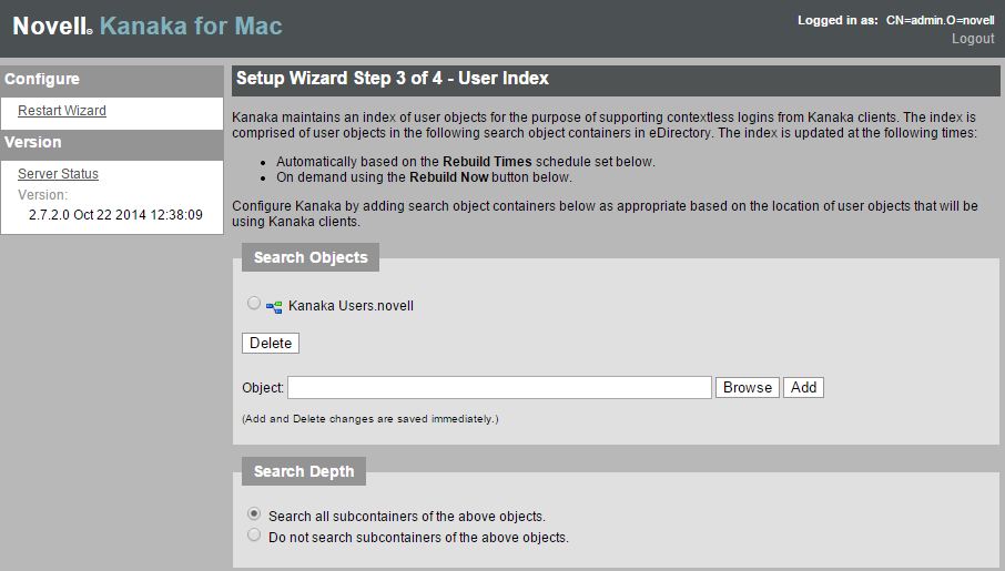 Novell Kanaka for Mac maintains an index of user objects for the purpose of supporting contextless logins from the Kanaka Plug-in and Kanaka Desktop Client. The index is made up of user objects in a set of search object containers in eDirectory.