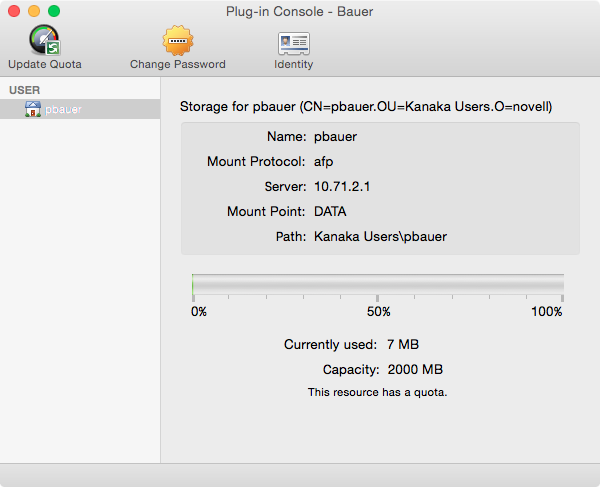 To use the Kanaka Plug-in, simply log in as an eDirectory user. Kanaka provides contextless login, so just the common name of the user is needed. After login, the user’s home directory is mounted and a link is placed in the Dock or the mount point is displayed on the desktop. Kanaka also discovers and mounts group shared storage and places it in the Dock or on the desktop.