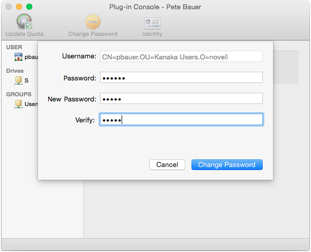 When your eDirectory password expires and you have the Kanaka Plug-in installed on your Mac, you are prompted at login time to change your password. The Kanaka Plug-in does not honor grace logins set by ConsoleOne or Universal Password policies, and requires you to enter a new password immediately.