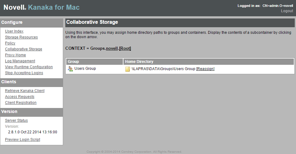 However, Novell Storage Manager is not required for Novell Kanaka for Mac to deal with collaborative (group) storage. When the Novell Kanaka for Mac schema extensions are applied to the tree, the Novell Storage Manager group home directory is also added, if it is not already present. This Web interface provides a methodology for assigning the group Home_Directory attribute for each group in the tree, analogous to setting the home directory attribute on a user.