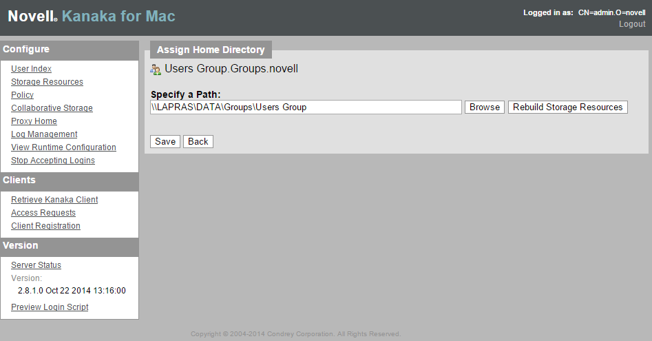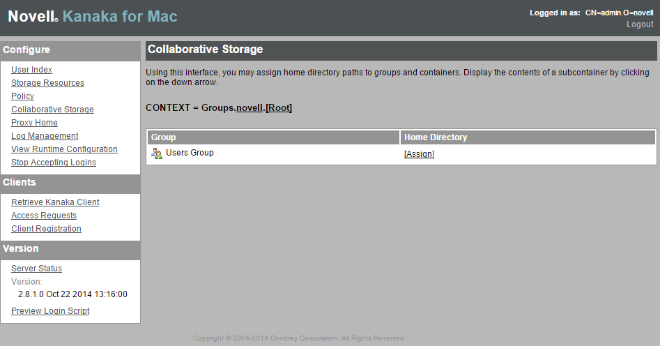 If all group storage is already managed with Novell Storage Manager, there is nothing that you need to do for Novell Kanaka for Mac to auto-mount group storage for all users. Otherwise, you should use Novell Kanaka for Mac to assign the Home_Directory attribute for each group that is not managed by Novell Storage Manager. Simply click Browse the Tree in the menu to the left, locate the group, and click Assign. This allows the administrator to browse to a destination path and set the home directory for the given group.