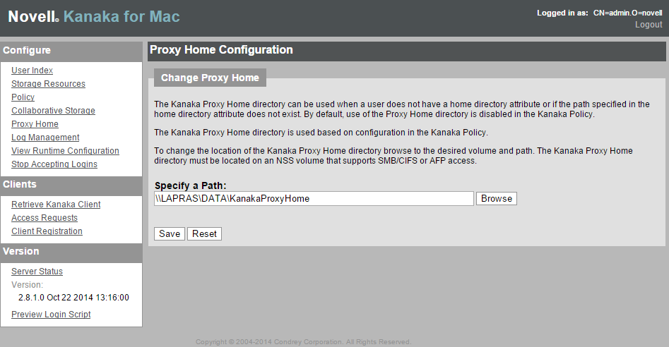 The proxy directories are managed in the Web management interface for Novell Kanaka for Mac at https://server_ip_or_DNS_name:3089