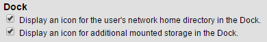 This option displays an icon on the Dock for the user’s home directory and for any group storage that is configured.