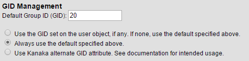 For example, if you want students to have a GID of 20 (staff) and teachers or administrators to have a GID of 80 (admin), you can set the cccKanakaGidNumber attribute for the teachers or administrators to a value of 80 and choose the Use Kanaka alternate GID attribute option.
