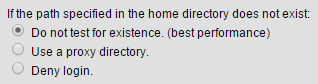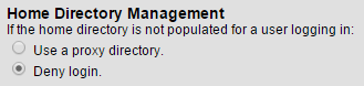 This setting gives you the option to allow the user to log in or not if the Home Directory attribute is not populated. If you choose the proxy directory option, you need to add and configure a proxy home directory for your environment. This is a directory with limited rights, and you can display a message to explain (such as a document or HTML page) that the user does not have a home directory defined, and perhaps direct them to a contact at the Help Desk.