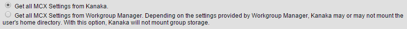 Novell Kanaka for Mac clients can receive Managed Client Settings (MCX) configured in the Kanaka policy or from a properly configured OS X server. The following options instruct the client to use MCX settings generated by Novell Kanaka for Mac or to use settings obtained from an OS X server.