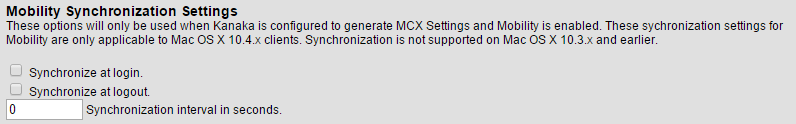 There are several options available in Novell Kanaka for Mac to direct the behavior of the client. These options offer some flexibility in the setup to allow a more customized fit for individual installations. There are options for User Management, and for Managed Client Settings. The Mobility managed client option requires Mac OS X v10.4 and above, and Mobility Synchronization requires Mac OS X v10.4 and above.