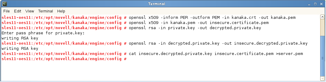iManager exports server certificates in the PKCS#12 or PFX format. This format needs to be converted to PEM format for the Kanaka Engine. You can use one of the following two methods to do so: