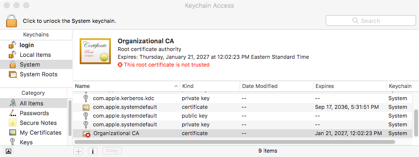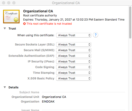 If you select the certificate Organizational CA, note that the text indicates that the root certificate is not trusted.