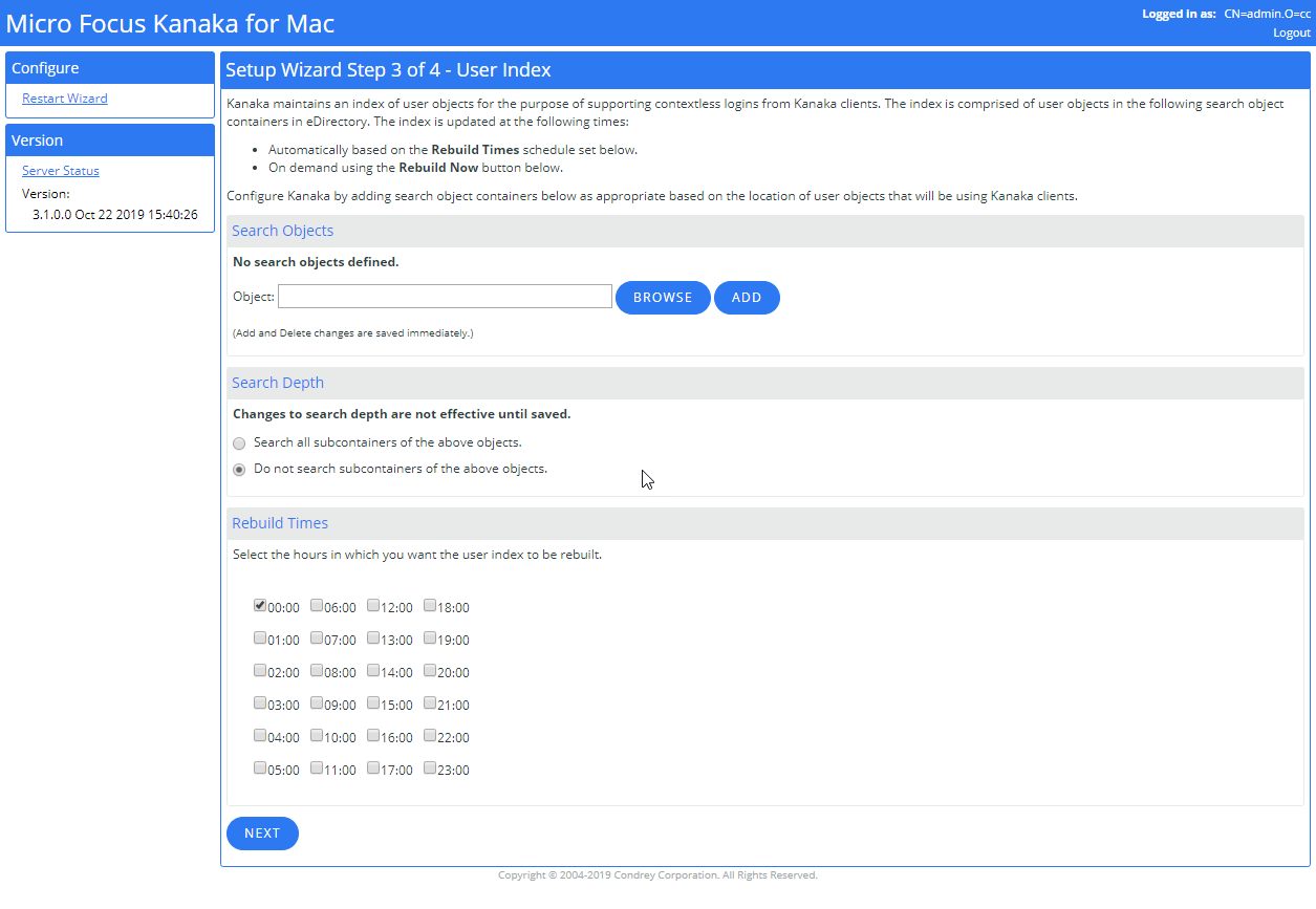 Micro Focus Kanaka for Mac maintains an index of user objects for the purpose of supporting contextless logins from the Kanaka Plug-in and Kanaka Desktop Client. The index is made up of user objects in a set of search object containers in eDirectory.
