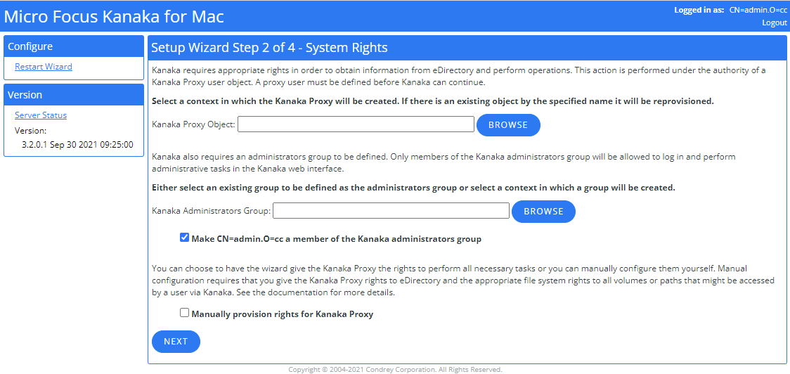 The Kanaka proxy object is also created. By default, this user object is automatically assigned Supervisor rights at the root of the eDirectory tree. You can remove this rights assignment and assign rights more granularly to the tree and the associated file systems. The object needs the following minimum rights: