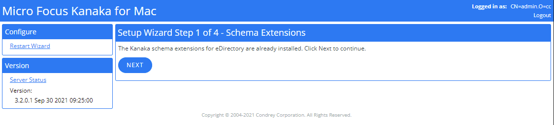 Enter eDirectory credentials capable of modifying directory services and schema, such as an Admin or Admin equivalent.