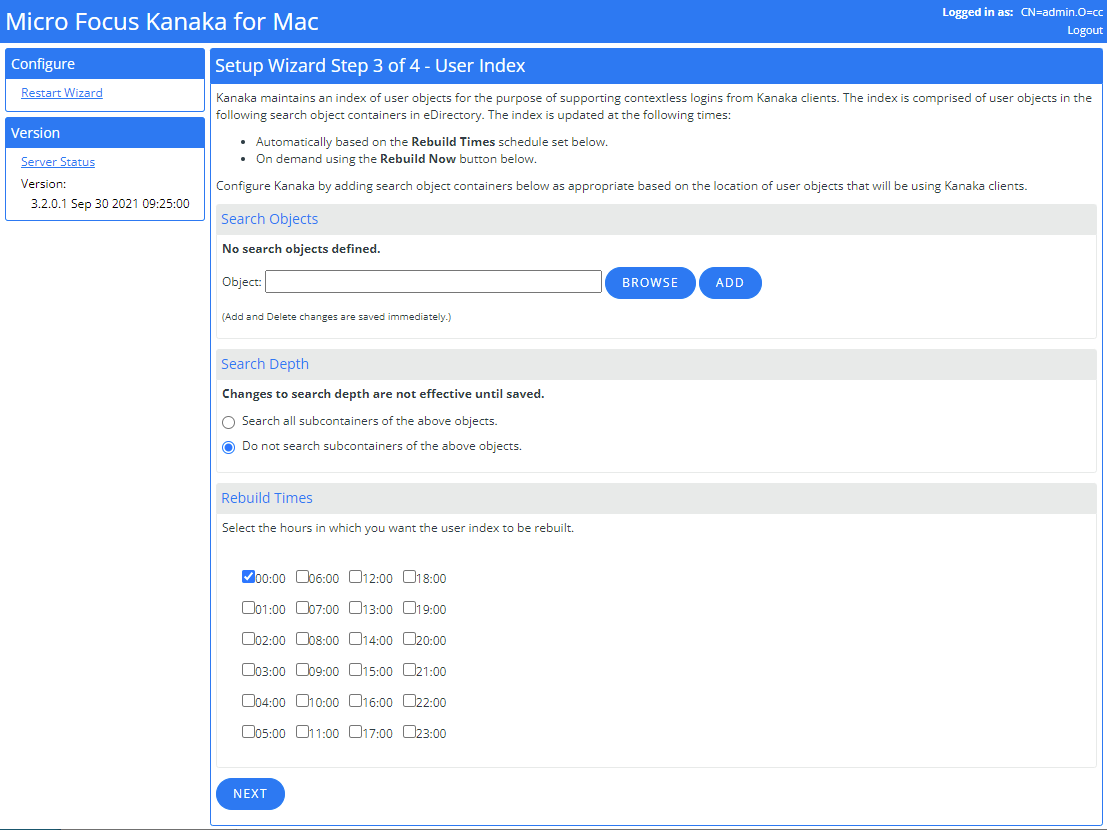 Micro Focus Kanaka for Mac maintains an index of user objects for the purpose of supporting contextless logins from the Kanaka Plug-in and Kanaka Desktop Client. The index is made up of user objects in a set of search object containers in eDirectory.