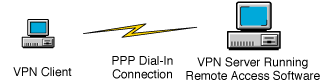 With this option, the client uses PPP to dial directly in to the VPN server, as shown in VPN Client Using a Direct Dial-In Connection. Although a direct PPP connection has guaranteed bandwidth, it is more expensive and might not be any faster than an ISP connection.