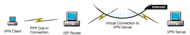 With this option, the client connects to the VPN server using the Point-to-Point Protocol (PPP) through an ISP, as shown in VPN Client Using an ISP Connection. Although using an ISP connection does not offer guaranteed bandwidth and could be slower than a direct dial-in connection, this option has the advantage of being less expensive than a direct dial-in connection. In addition to the cost of the phone line, a direct dial-in connection requires that you maintain a dial-up server, modems, and other related equipment.