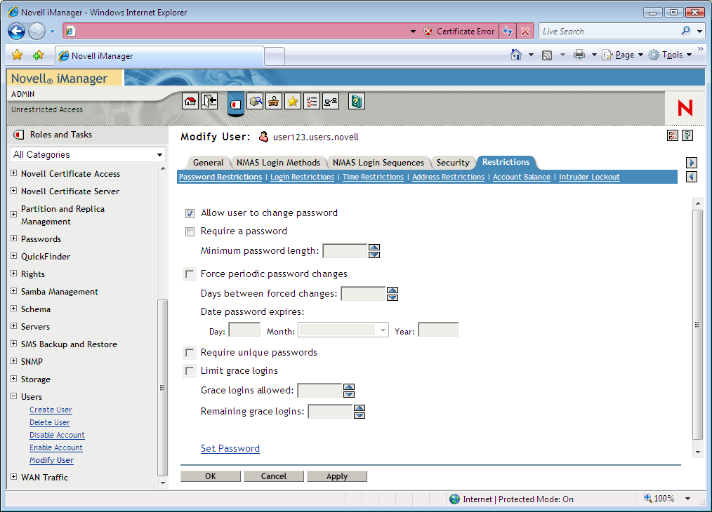 Login restrictions are limitations on user accounts that control access to the network. These restrictions can be set by an administrator in Novell iManager for each user’s eDirectory™ User object and include the following:
