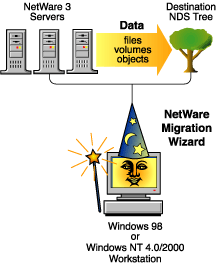 Novell® NetWare® Migration Wizard 6.5 copies and consolidates your NetWare 3 bindery and file system from one or more existing NetWare 3 servers to a destination NDS® tree.