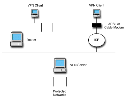 With this option, the client accesses the VPN server through an ISP using a cable modem, an ADSL device, a LAN connection, or an established dial-up connection, as shown in VPN Client Using a LAN Connection. If it is available, a broadband connection is faster and less expensive than a dial-in connection.