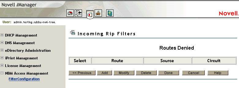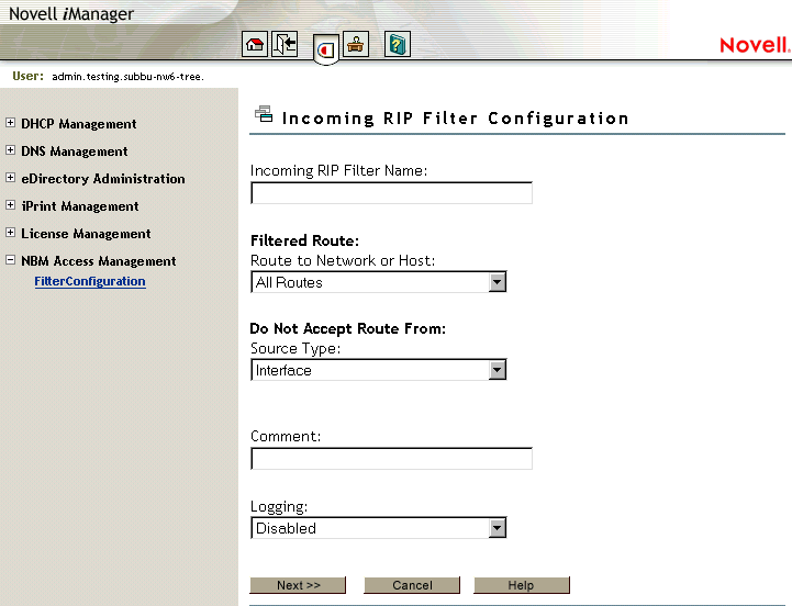 Incoming RIP Filter Name---Enter the name of the RIP filter. This name becomes the distinguished name of the filter in the eDirectory.