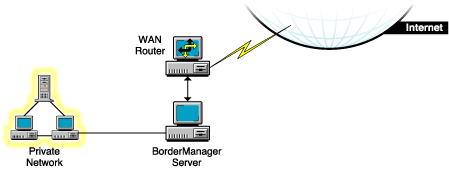 In this example, the Novell BorderManager 3.7 server and the WAN router can be reached from the Internet. In addition, the Novell BorderManager 3.7 server acts as a screening router on the private network. Using Network Address Translation (NAT) and packet filtering, the Novell BorderManager 3.7 server can be configured to block traffic on specific ports, and only a select number of services can communicate with it.