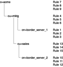 However, when border_server_2 builds its access control list, it first reads its own access rules, then the access rules in ou=sales, then the access rules in ou=mktg, then the access rules in o=acme. Note that the rules in ou=sales are used only by border_server_2, because it resides under the ou=sales context.