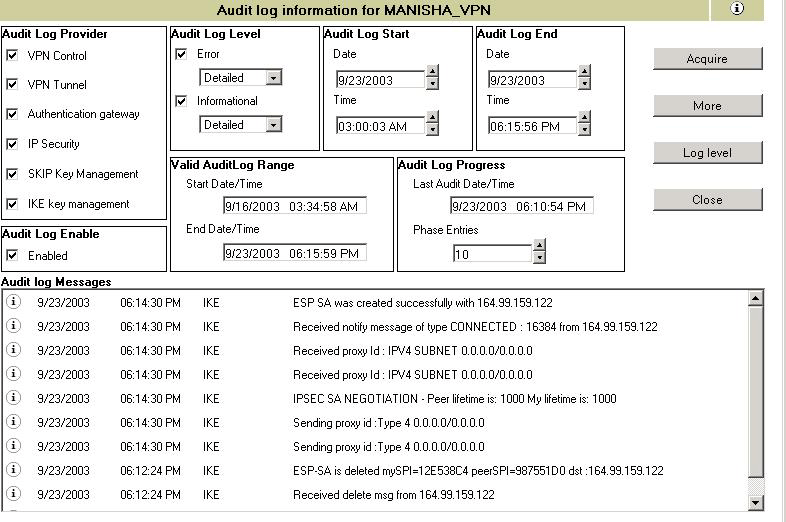 When you click Acquire, Audit Log messages are displayed in the box towards the lower part of the page. The audit log messagesshow information for various activities that are taking place on the server. The administrator can use the audit log facility to understand what went wrong for authentication failures, or what could have been the cause of failure during IKE negotiation. Click More to view messages that cannot be displayed in the available space.