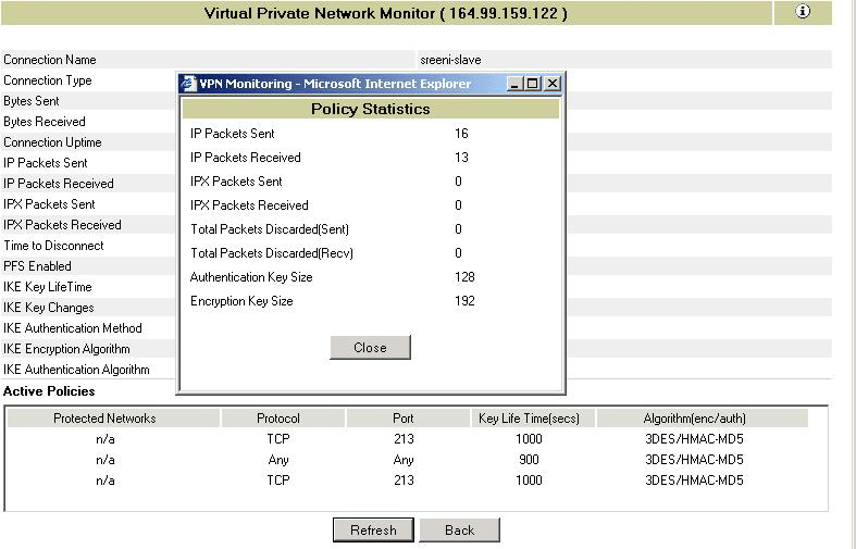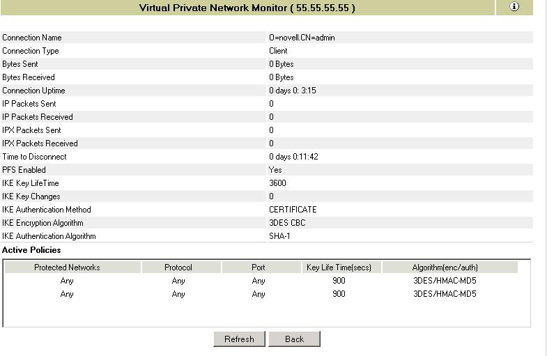 Active Policies: The policies displayed in the lower box on the page are active traffic rules enforced for a connection. Click a traffic rule to see the packets passed because of this traffic rule. If a traffic rule is configured as Deny it won't be displayed here. If the same policy is displayed twice, one of the policies is about to expire and a new SA is being negotiated. The algorithm shown here is used to protect the data traffic.