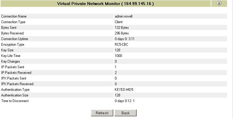 In the NRM VPN view status menu (see VPN View Status) click the Real Time Monitor link for a selected member to display a page with the following information:.