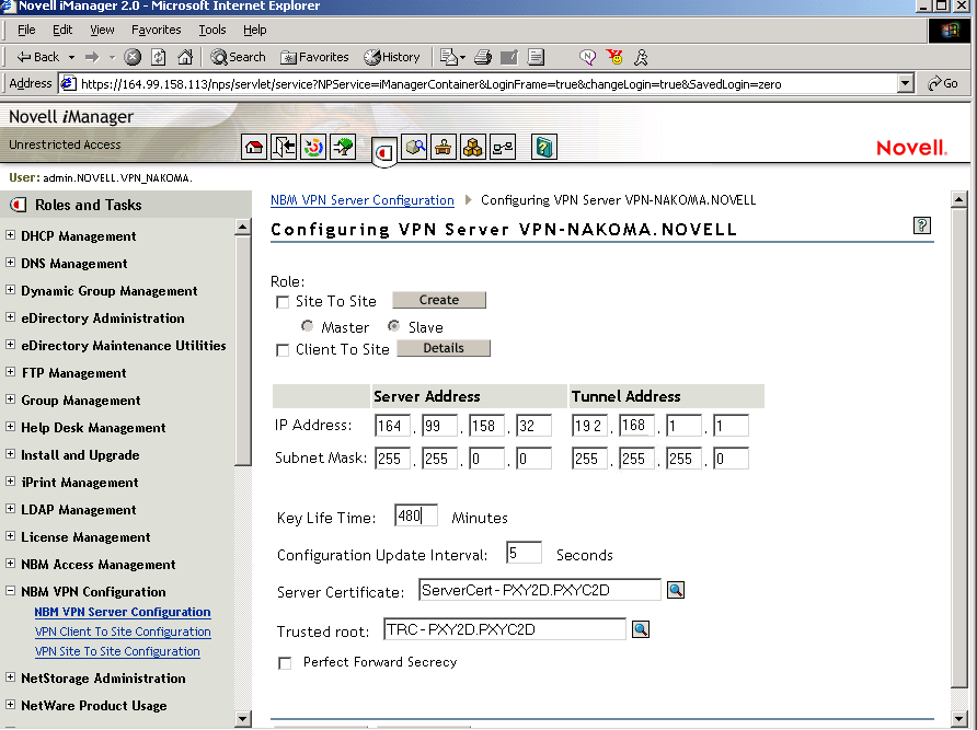 Click the NBM VPN Server Configuration role to display the following page: