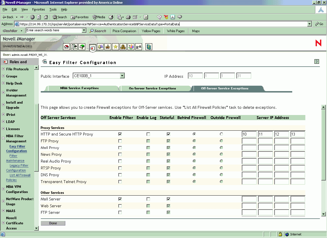 Off Server Services (where firewall and services run on different machines) exceptions are classified into two main categories, under which various services are available.
