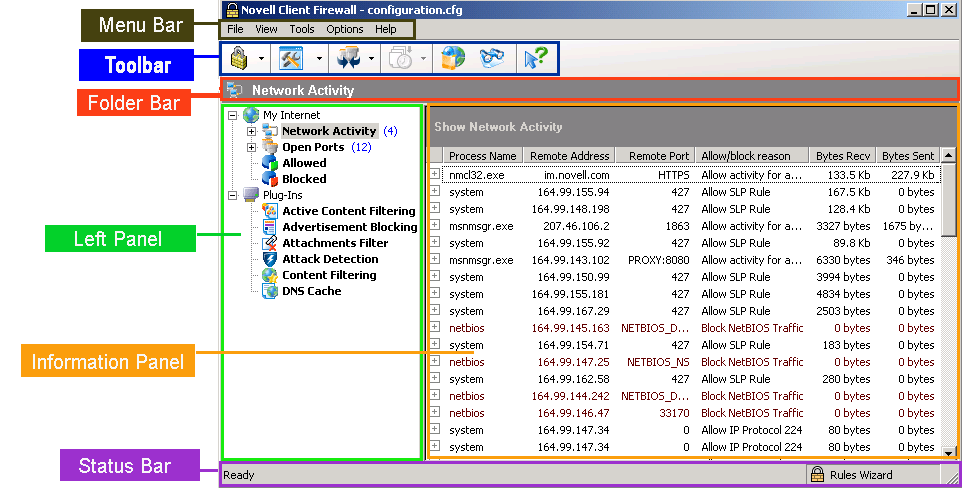 The main window is your central control panel of NCF. It is used to monitor the network operations of the computer and to modify the firewall settings.