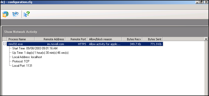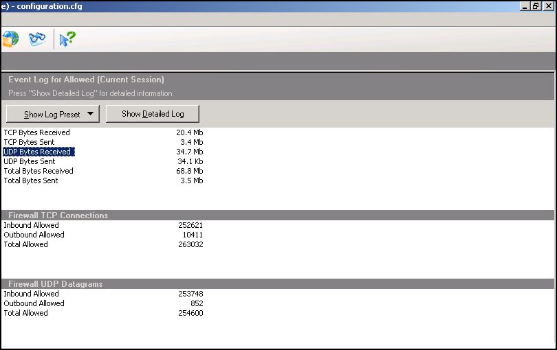 Although the details of the logs are intended for advanced users, the above items are important when you need to see the statistics on established connections or bytes sent and received. To view the logs in more detail, click the Show Detailed Log button located on the Information Panel of Allowed, Blocked, and Reported items. (For more details, refer to The NCF Log System.) You can also use these lists to make certain that NCF is correctly configured and is doing the job you need and want.