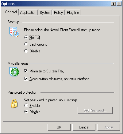 Minimize to System Tray---When selected, a button is not placed on the task bar for NCF's main window whenever it is minimized. To see NCF's main window, simply double-click NCF's system tray icon, or right-click it and then click Show Novell Client Firewall.