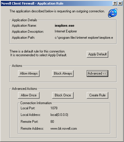 Whenever a new application requests a network connection, the Application Rule window is displayed: