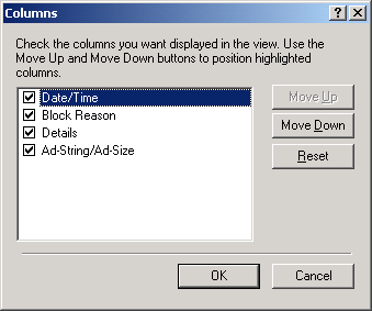 To change the sequence of columns in your log, simply click-and-drag the columns in the Information panel to arrange them in whatever order you want. This can also be done in the Columns dialog box by selecting a column and then clicking the Move Up or Move Down button. To revert to the default order, click Reset.