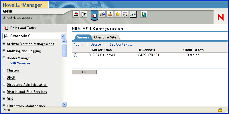 This example shows a server BLR.RAMKI.novell with public IP address 164.99.171.77 configured as a VPN server with client-to-site services enabled and site-to-site services enabled. This VPN server is a master of the site-to-site service to which it belongs.