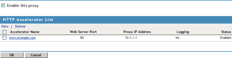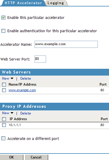Enable This Particular Accelerator: Select this check box to enable the configured server. You can disable the server if you are configuring multiple accelerations.You can disable one or more servers without affecting the other accelerated sites.