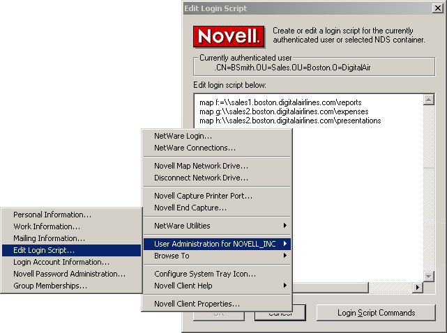 In addition to creating User login scripts in Novell iManager or ConsoleOne, you can also add user login scripts to User objects from the N menu in the system tray. This lets you customize the login script for the user that is currently logged in to the network, without running iManager or ConsoleOne.