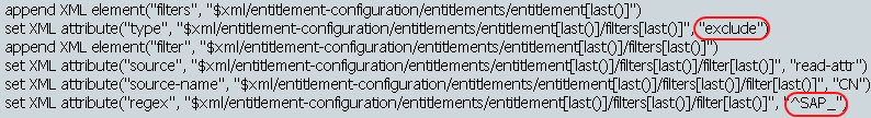 The filter is an XML filter element that is appended to the entitlement configuration object. By default, the filter element contains an attribute type that has a value of exclude. The filter element holds individual filters. Each filter contains the following attributes: