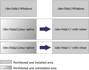 Depending on the initial status of the drive and how it was previously partitioned, it is possible to create the default partitioning in the following ways: