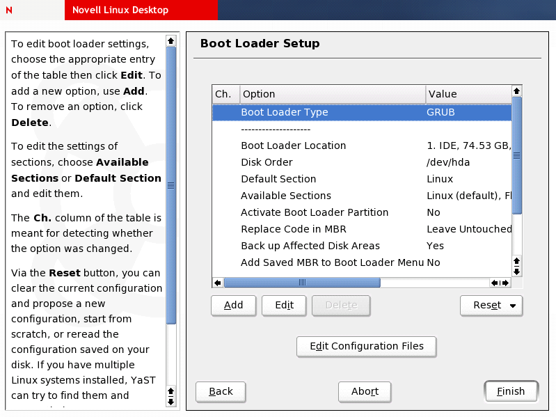 For a detailed description of this module and some background information on GRUB, the NLD boot loader, see “Chapter 8: Booting and Boot Managers” in the SUSE LINUX Enterprise Server 9 Administration Guide