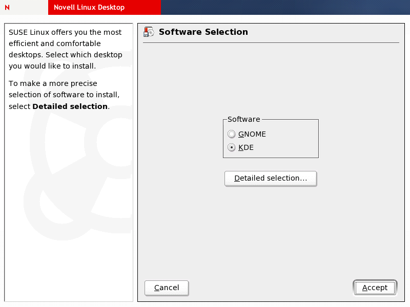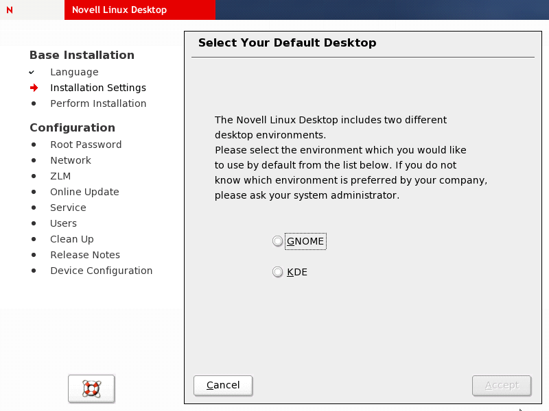 Novell Linux Desktop ships with two fully fledged desktop environments, GNOME and KDE. Selecting one of them at this point limits the scope of your installation to a set of default system packages plus all the packages provided by the desktop of your choice. If you do not know which environment your company prefers, ask your system administrator. For more information on the desktop environments, see the Novell Linux Desktop GNOME User Guide and the Novell Linux Desktop KDE User Guide.