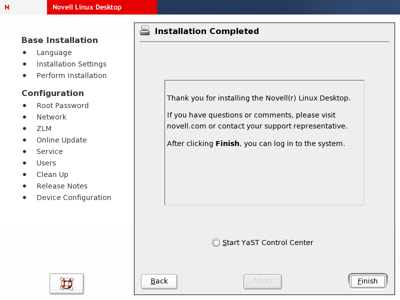 After you have read and acknowledged the release notes, click and finish the installation by optionally configuring additional hardware items such as printers, sound devices, or joysticks. These items can always be configured later in the installed system by launching the YaST Control Center and selecting the appropriate modules. See The YaST Control Center for further information on the configuration modules offered by YaST.