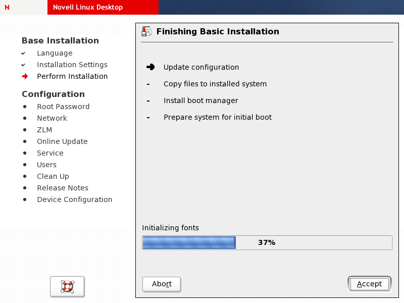 YaST continues with the installation requesting additional CDs or, if you installed from DVD, moves on to the system configuration.