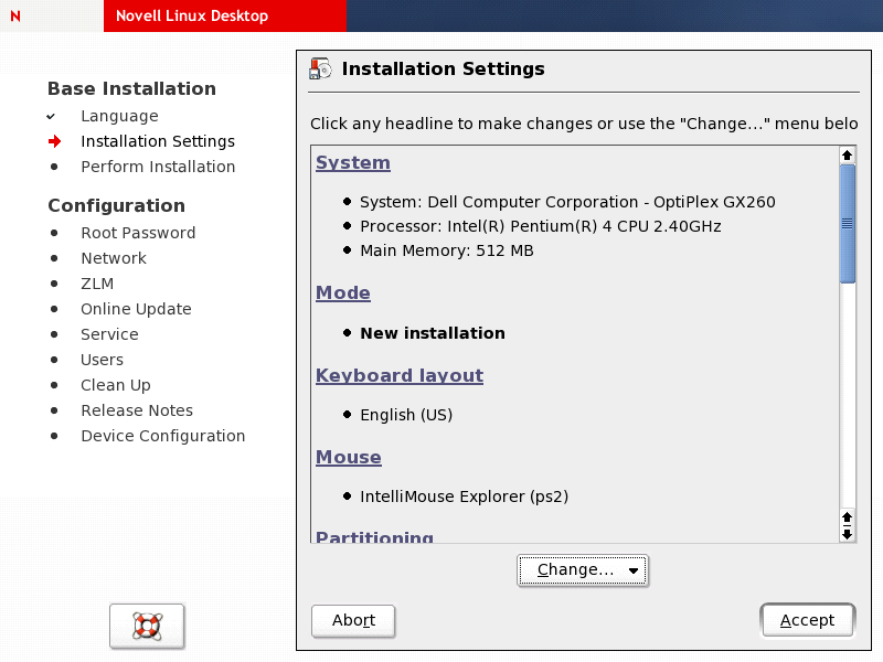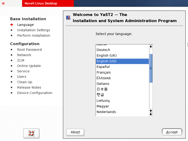 Installation can be done from the distribution CDs by inserting Novell Linux Desktop CD 1 or DVD and then booting the workstation. This type of installation requires user interaction.
