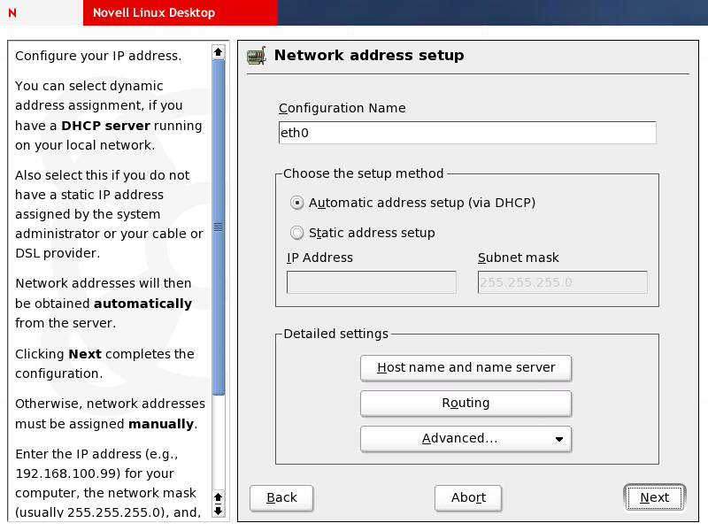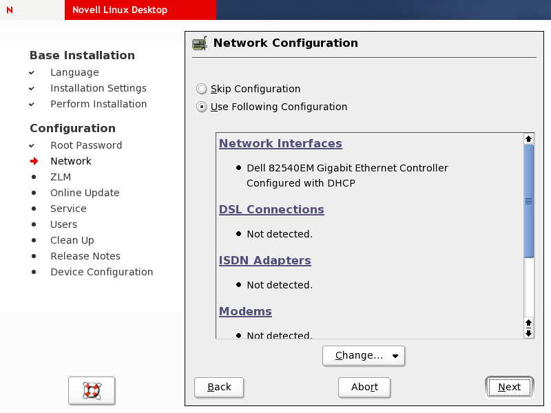 HINT:If your network is set up to support DHCP-based configuration of the network clients, you can just accept the network settings as preconfigured by YaST during installation. DHCP network configuration works out of the box with any NLD installation. If your network doesn't include DHCP services, configure the detected network devices from scratch.
