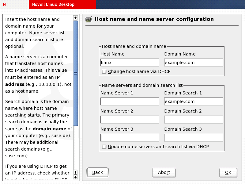 Specify a hostname and a domain name for your machine. If necessary, get this information from your network administrator. Specify an IP address and search domain for at least one name server in your network. If possible, specify more than one to have a fallback server in place just in case the main name server of your network crashes or is offline.