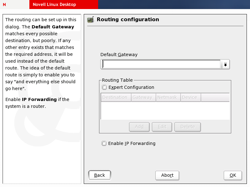 If you are in a local network that uses one particular host as a gateway to other networks and the Internet, type its IP address in (ask your network administrator for details). Select only if you intend to use your NLD machine as a router; otherwise, click to return to the dialog. Click to complete your network configuration.